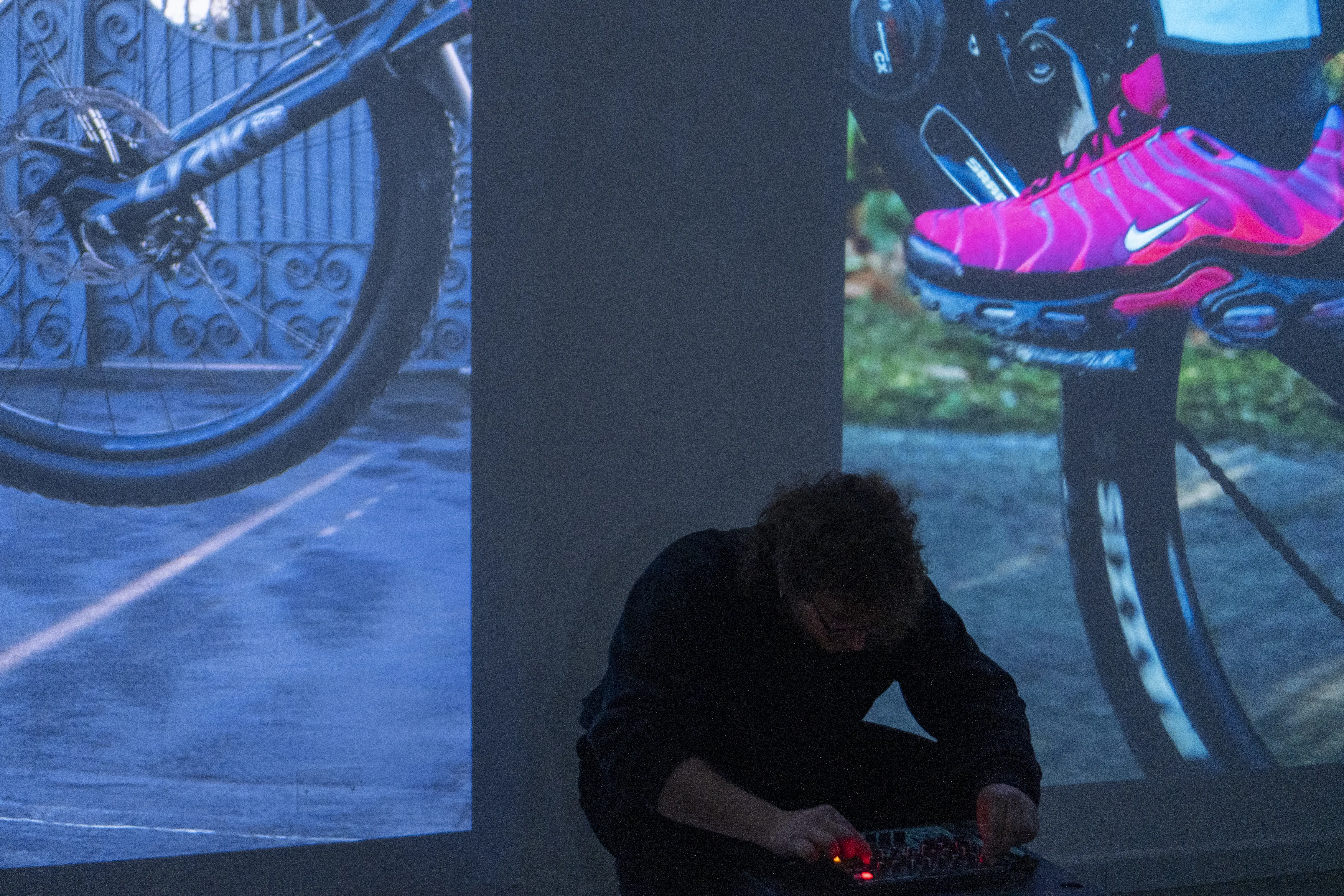 the artist pedals trying to crash into a wall, repeating the attempt several times. The gesture,