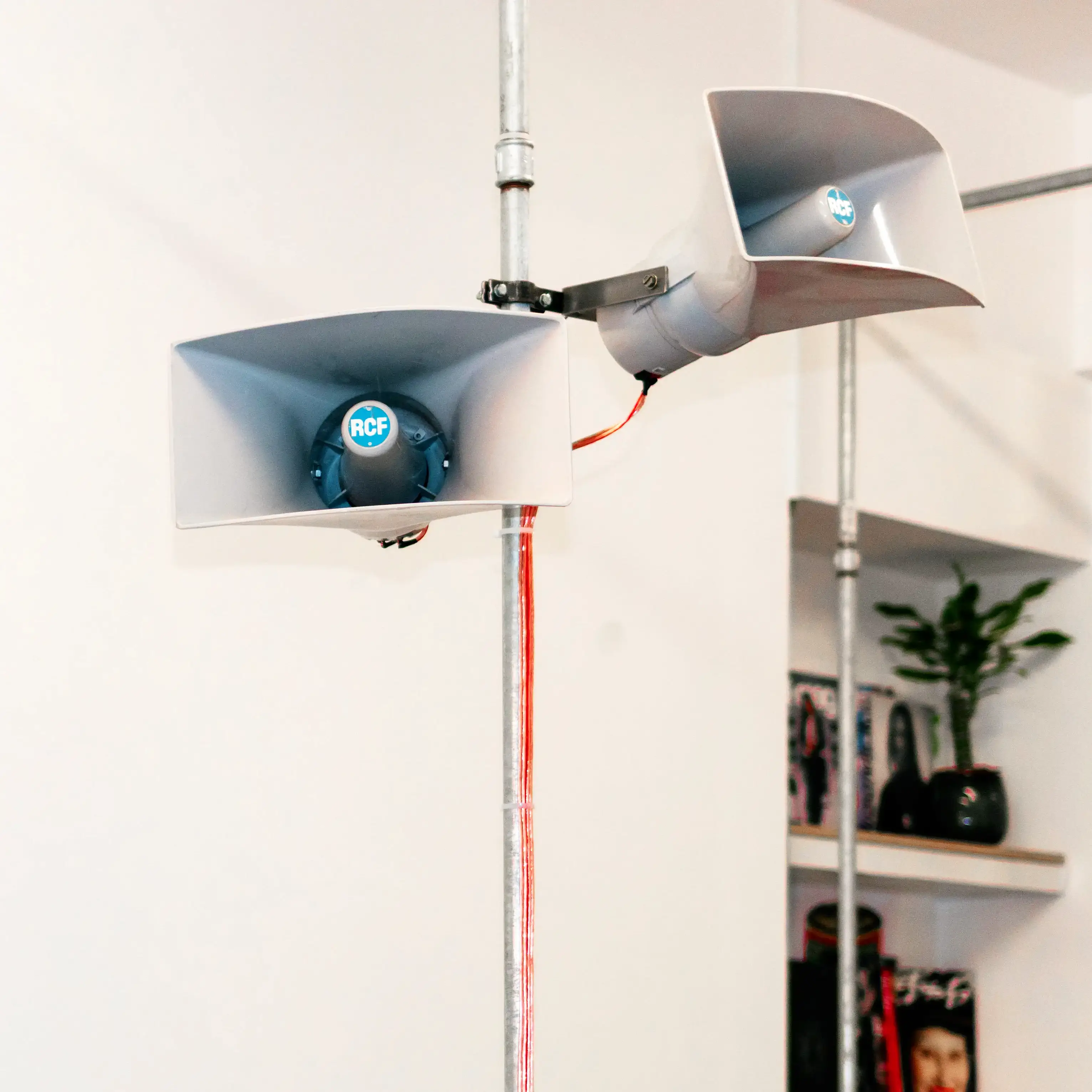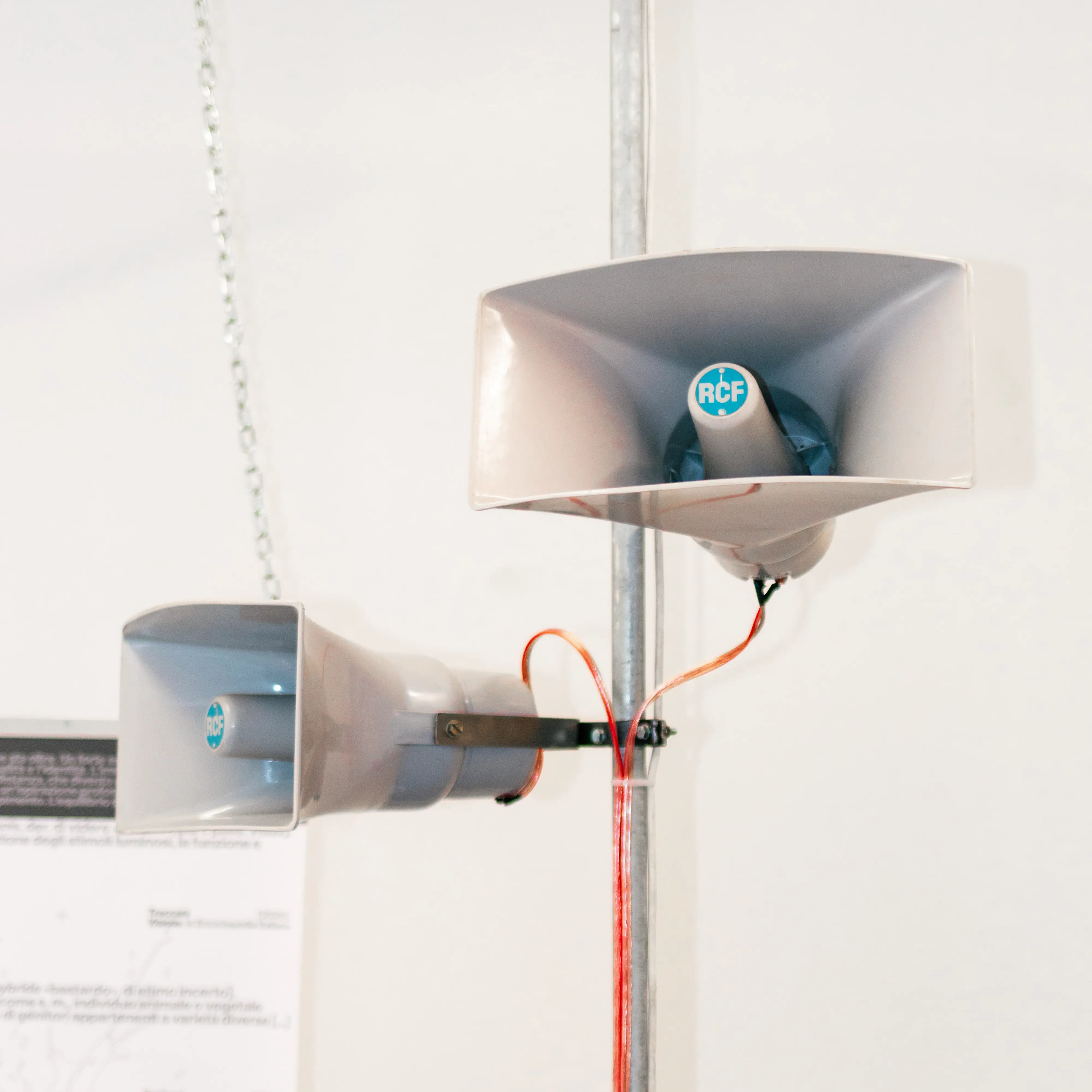Pressure or more commonly horn speakers are in fact devices that are often loosely used to amplify the voice. In the general culture they belong to sound installations in public spaces useful for broadcasting the voice of some authority, contextualized by the space they occupy. In front of a basilica the voice of the bishop, in a packed square the mayor or president, in a stadium the commentators or ultras leaders.